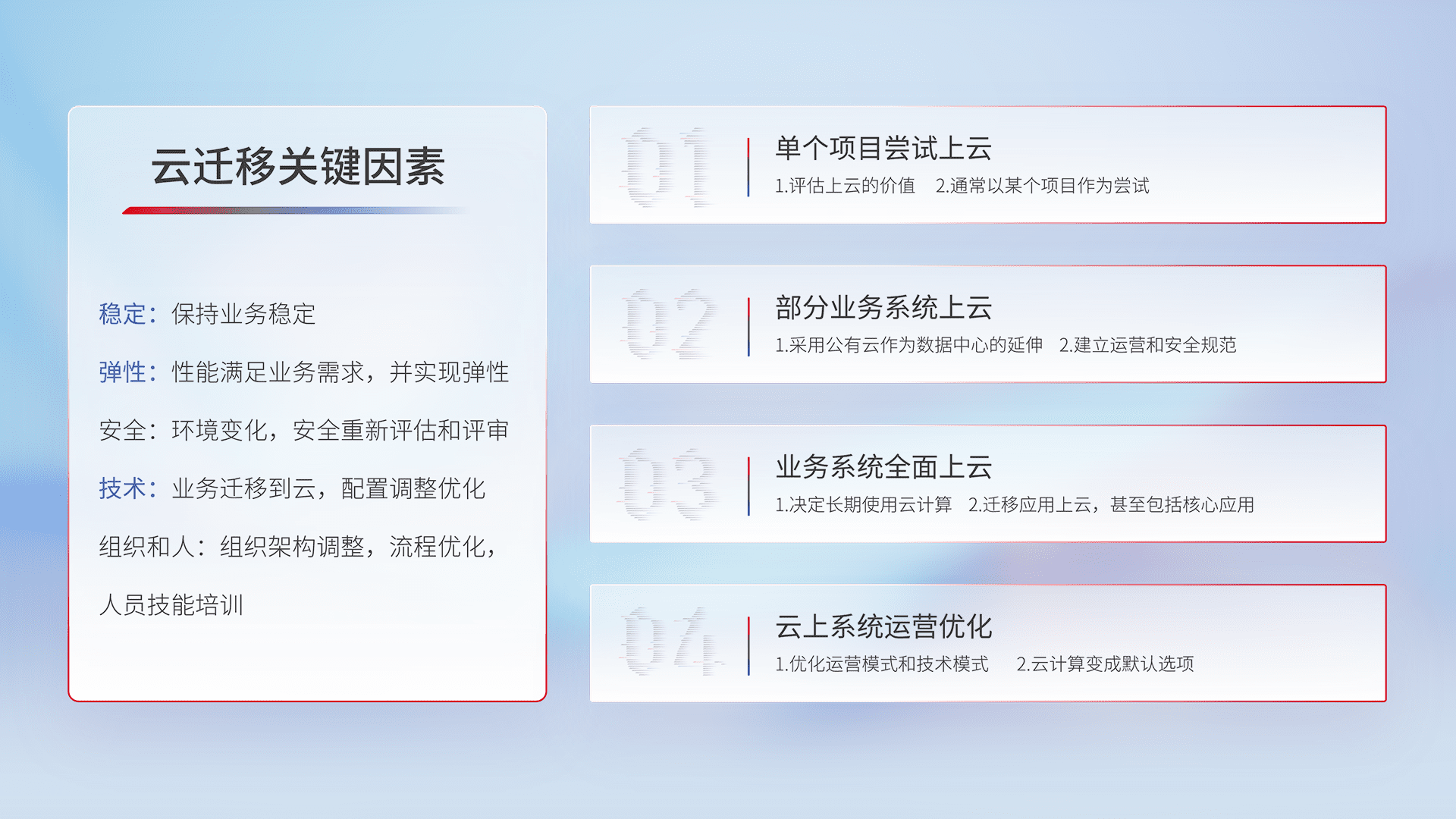 结合实际业务,,,,从规划设计、、云平台选型、、、、云原生改造、、数据迁移、、、、集成交付,,,,迁移全过程为客户识别最佳上云路径,,,做好风险识别管理,,,,设计网络架构、、、身份权限、、安全审计合规、、、操作审计、、、、日志审计、、、监控告警策略、、多站点容灾设计等,,对云上基础设施进行整体规划,,提升IT治理水平,,以满足弹性、、高可用、、高性能的需求。。。