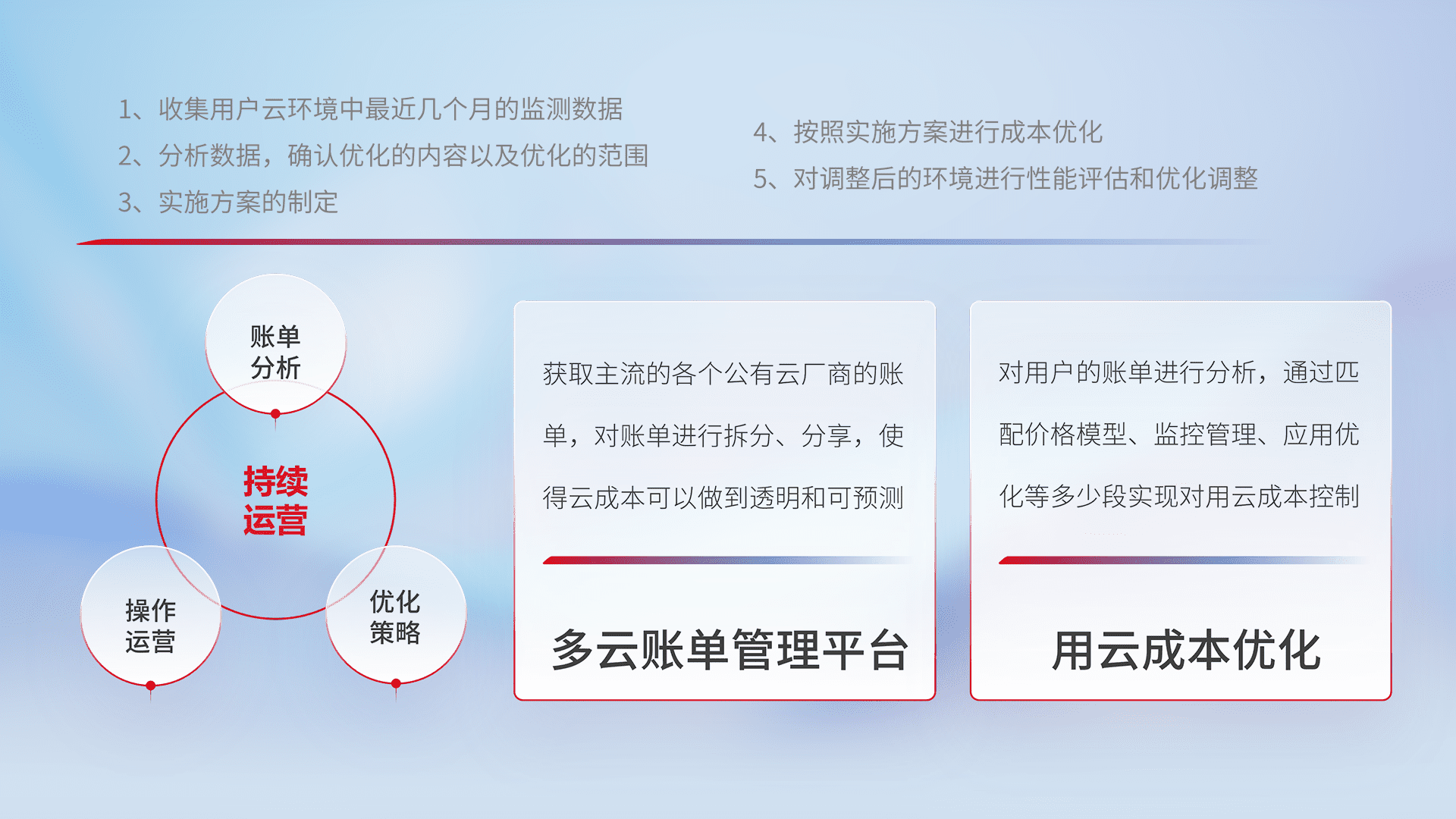 通过多云纳管,,,,以统一的资源数据模型把客户的云资源进行抽象和封装,,进而实现对多云资源的统一操作,,,保障云资源管理的可靠性、、、稳定性与可用性。。量身定制化运维内容,,,配置、、开发运维、、、补丁管理、、备份、、监控、、认证和访问管理、、、、审计和日常巡检等,,,保障在用云过程中的可靠度,,稳定度以及高可用率。。。