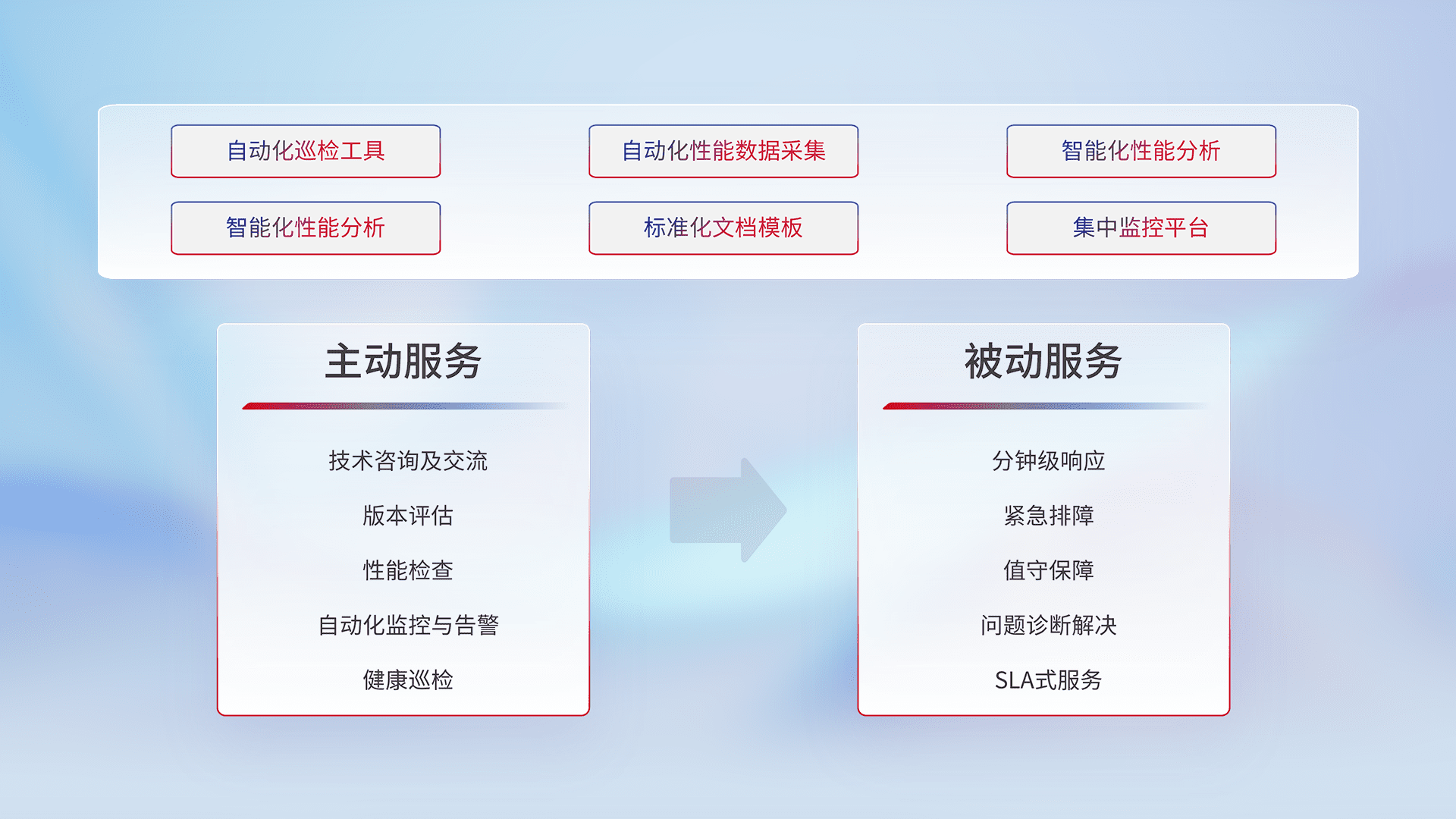 智能化工具和标准化文档,,,,保障服务质量,,提供主动服务(包含技术咨询、、版本评估、、、、性能检查、、、自动化监控与告警、、、、健康巡检)和被动服务包含(分钟级响应、、紧急排障、、、值守保障、、、问题诊断解决、、SLA服务)。。